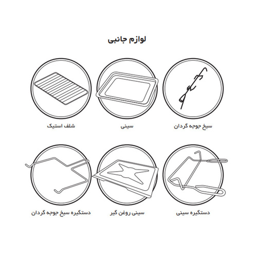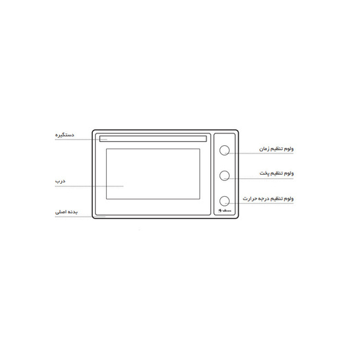 سایر توضیحاتدارای هفت برنامه پخت (کلید نه حالته)، دارای ترموستات تنظیم دما (تا دمای 300 درجه سانتی گراد)، دارای تایمر مکانیکی 120 دقیقه (به همراه پخت دستی)، دارای لامپ داخلی فر، بدنه داخلی لعاب شده با لعاب easy to clean، دارای درب شیشه ای دو جداره، دارای شیشه داخلی لوئی، دارای جوجه گردان، بدنه پشت دو جداره، دارای سینی دو طرف لعاب (Easy to clean)، دارای شلف استیک و دستگیره سیخ جوجه گردان آبکاری شده، دارای شیشه سکوریت مشکی، دارای دستگیره آلومینیومی آنو دایز مات، دارای ولوم آهنی، سیستم آسان باز شوی درب فر، دارای دو عدد المنت حرارتی (بالا و پایین)، دارای شلف کناری با آبکاری نیکل کروم، جنس بدنه از ورق آهن با رنگ الکترواستاتیک (مشکی)